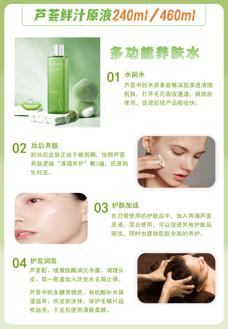 如果觉得日常护肤品不易推开或吸收,也可以直接在里面加入两滴芦荟鲜汁原液,混合使用,可以促进其他护肤品吸收;