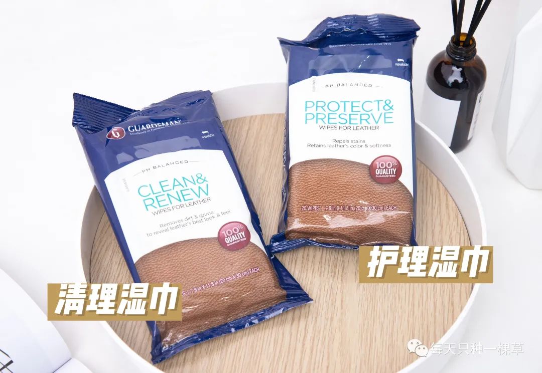 它分清洁湿巾和护理湿巾两种,真皮沾到污渍,先用清洁湿巾把表层的脏东西擦去,然后再用护理湿巾擦一遍,就可以护色、防止皮质变硬。