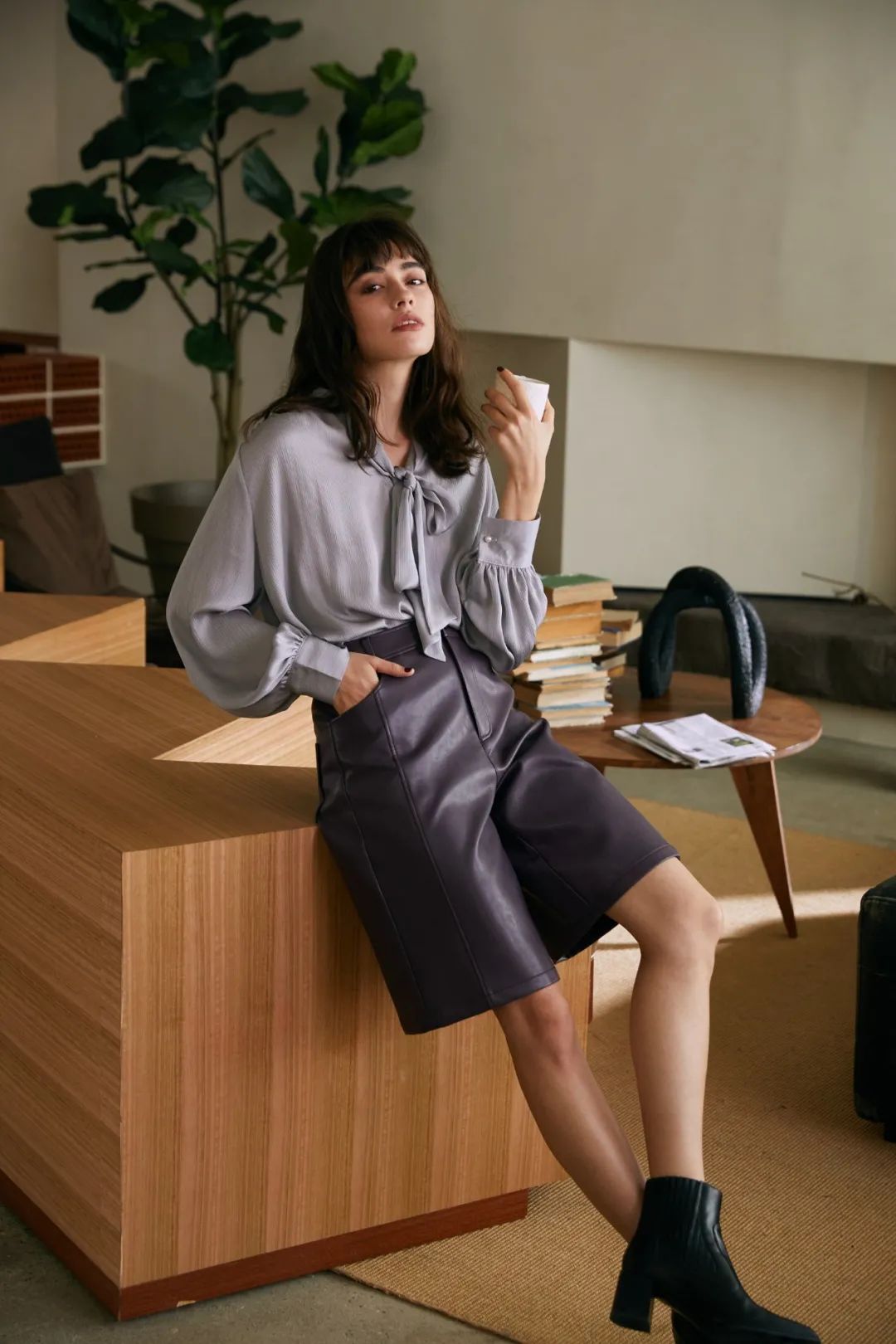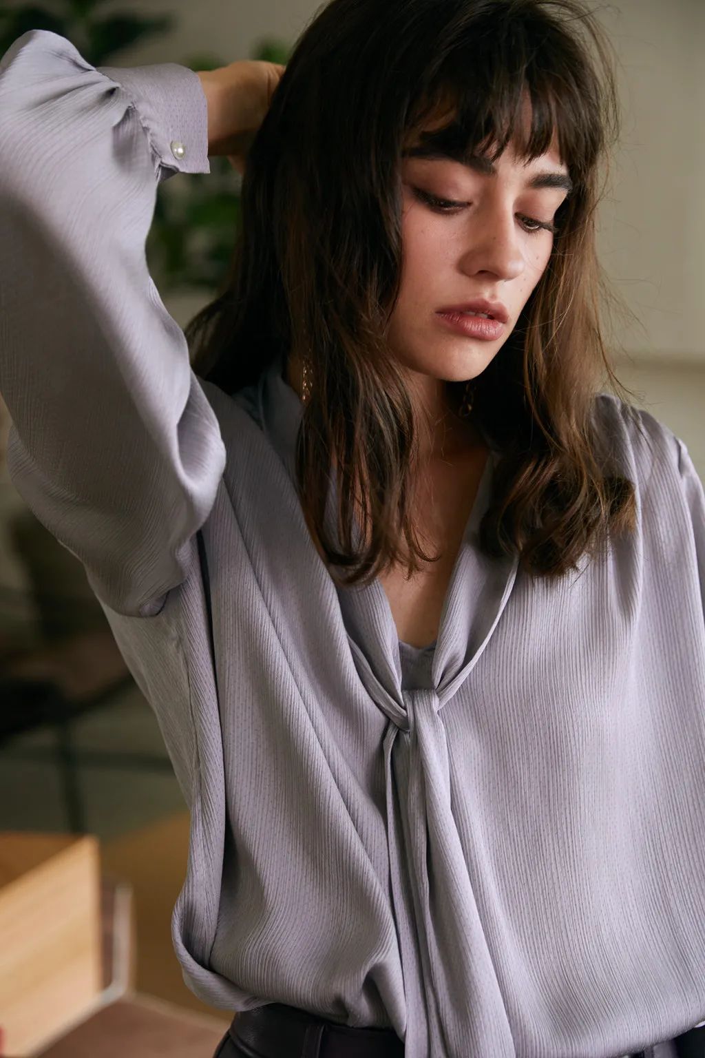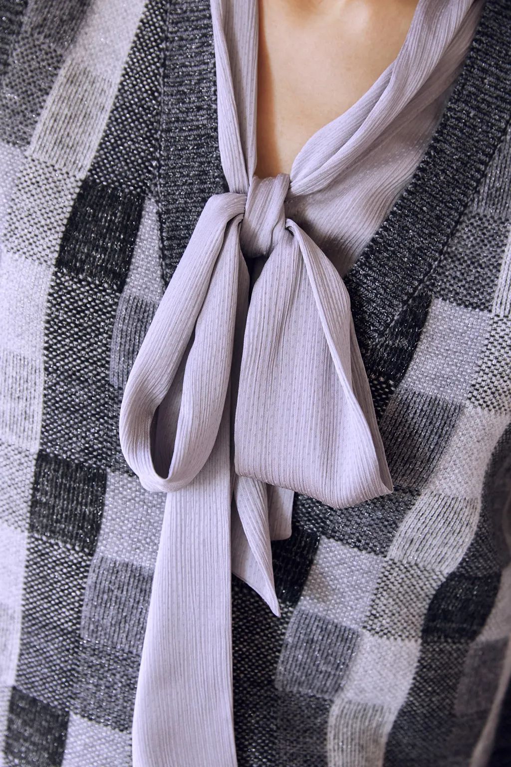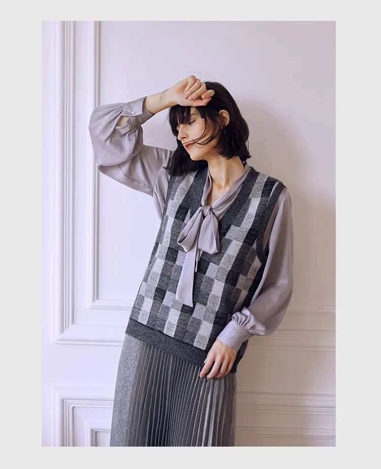 领口飘带和宽松灯笼袖的设计很适合叠搭背心,