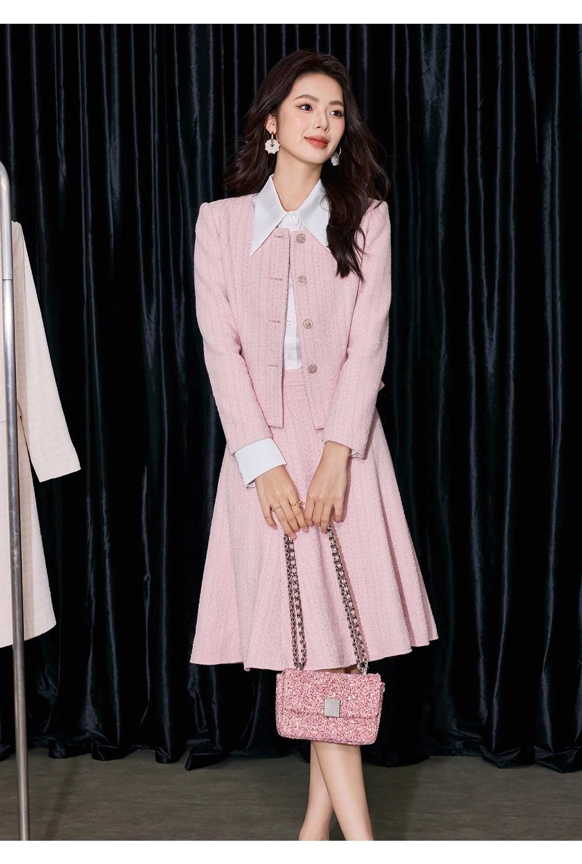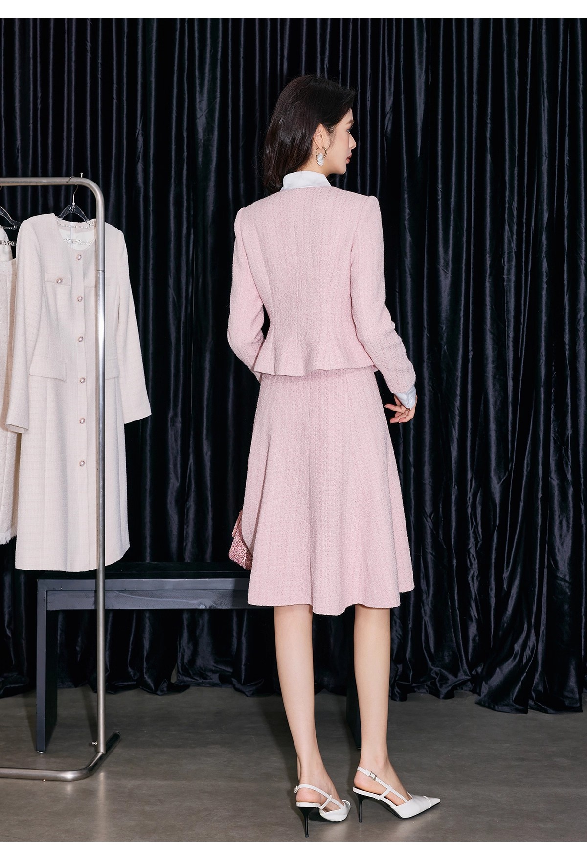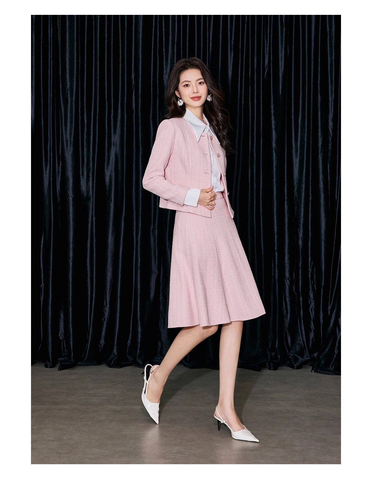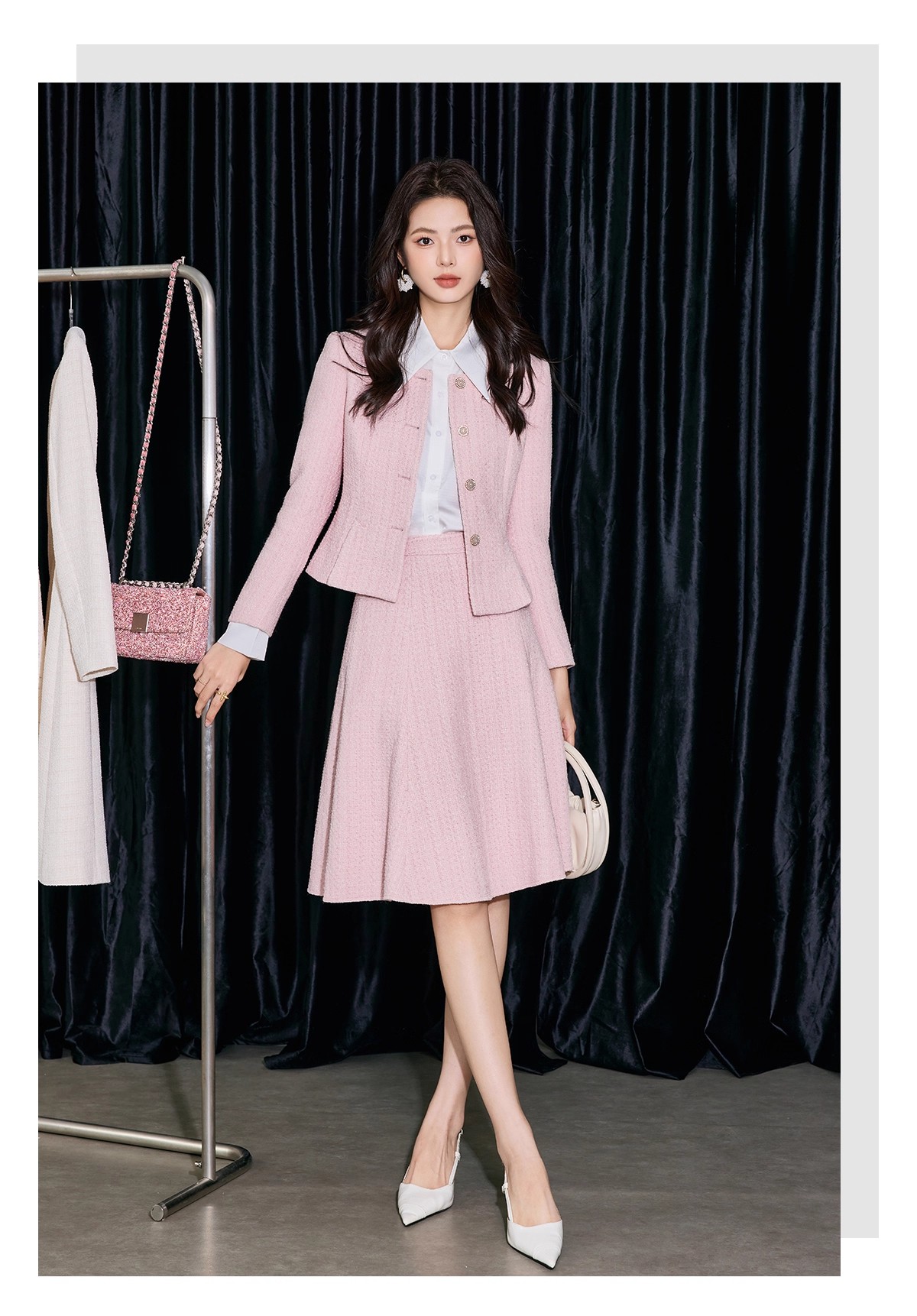 粗花呢面料自带的挺括感,让粉色也能穿出干练气场,短款外套的七分袖设计利落清爽,收腰剪裁精准勾勒腰线,将职场女性的飒爽与柔美巧妙融合。