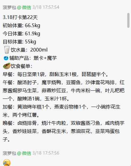 参与社群饮食打卡,每天吃得多而且不重样,连续22天已经减了10斤,有产品辅助掉秤速度更快!