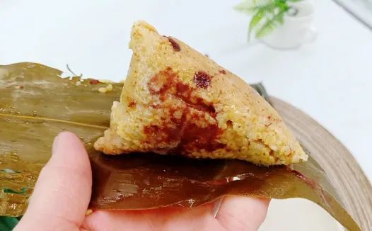 轻轻拨开它的外衣,粽子的清香顺着热气飘满整间屋子。不同于常见糯米粽的剔透,这款大黄米粽子金黄诱人,馅料清晰可见。