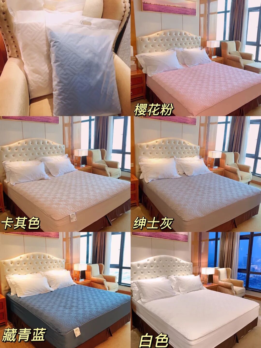有樱花粉、卡其色、绅士灰,藏青蓝、白色、5颜色可选,无论和什么颜色的被子搭配都无违和感。