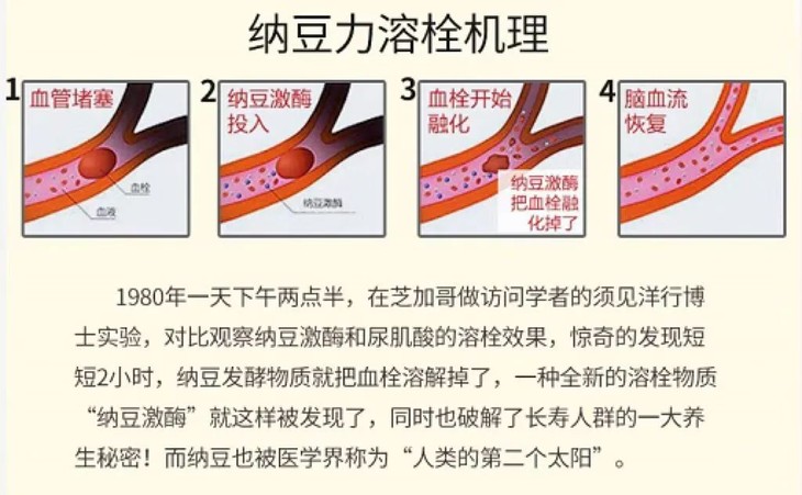 日本著名医学家须见洋行博士曾做过一个「两点半实验」把纳豆发酵液和血栓混合在一起,短短两个小时之内纳豆激酶就把血栓完全溶解了。