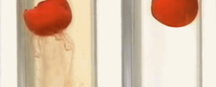 我们用动物淤血做了一个溶栓测试:清水中的淤血完全没变化,纳豆凝萃稀释液中的淤血飞快溶解,溶栓效果肉眼可见!太强了!