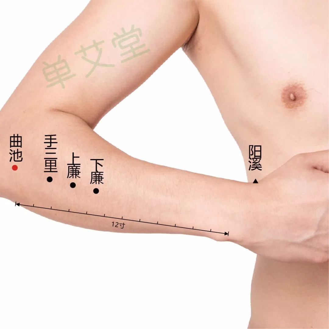 曲池穴是大肠经的湿浊之气聚集的地方,此穴为手阳明大肠经合穴,可以清利湿热,调理大肠气血,对“湿热”引起的荨麻疹、急性胃肠炎效果很好。