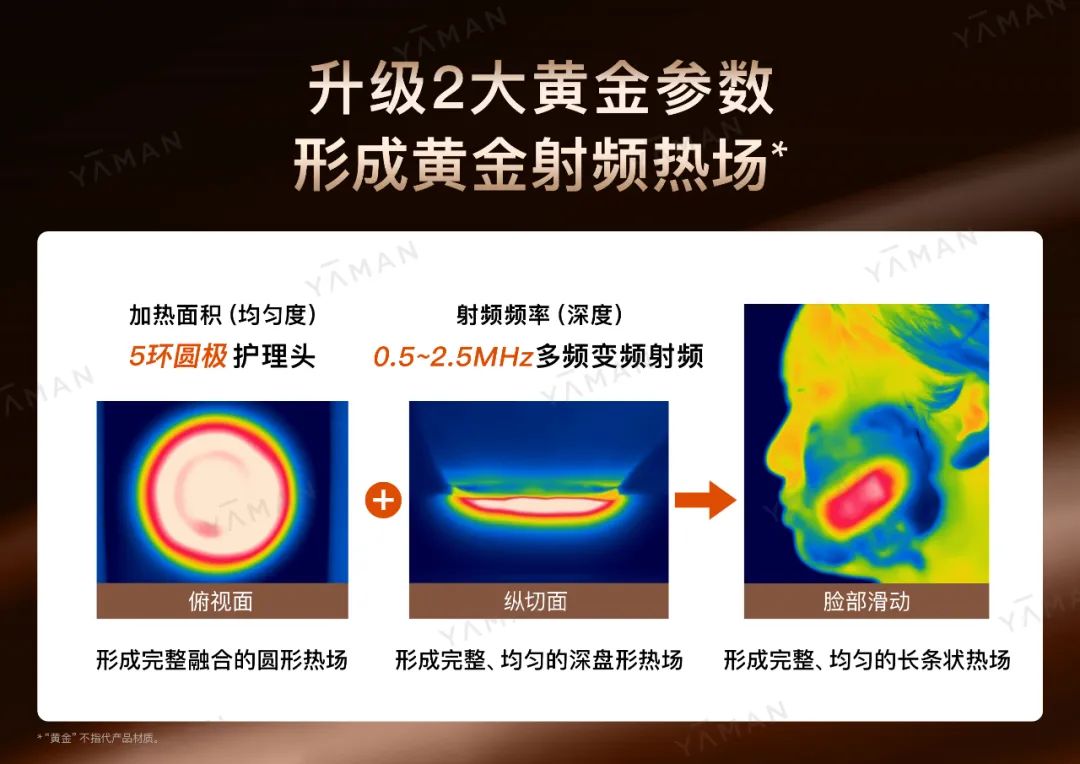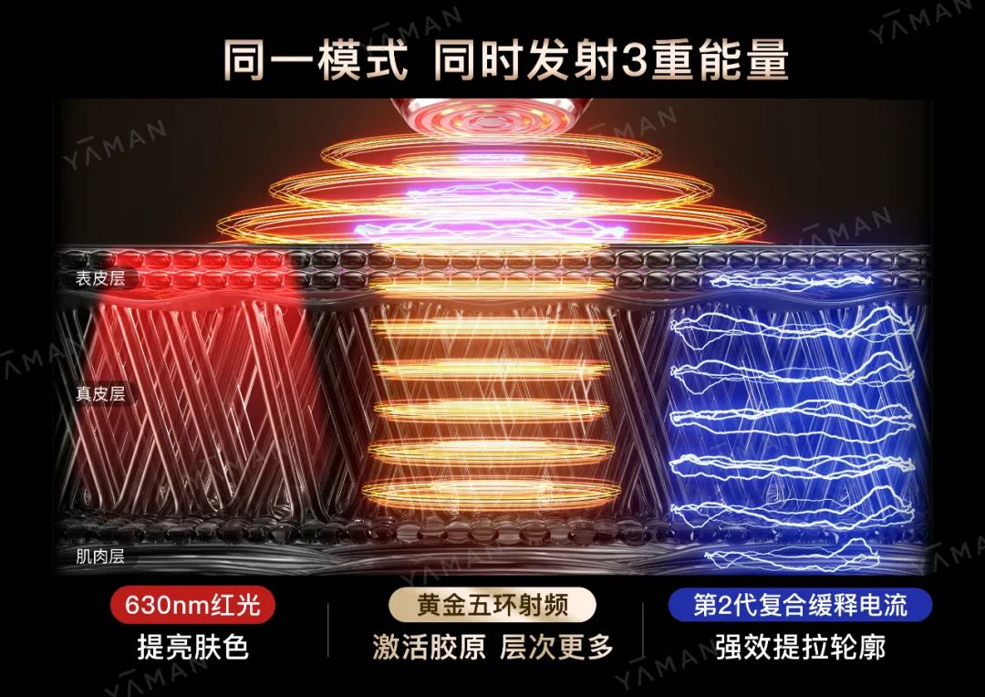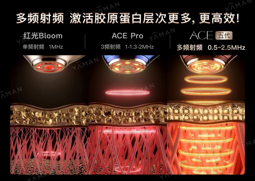 不仅外观变了,雅萌还联合日本光电教授塩嵜忠联合研发了【黄金五环射频】技术,并首次应用在的 ACE 五代上。它在使用的时候可以持续交替发射出0.5-2.5MHz的多频变频射频,更多层次覆盖到真皮层,让胶原蛋白嘭嘭长起来,起到紧致淡纹的效果!