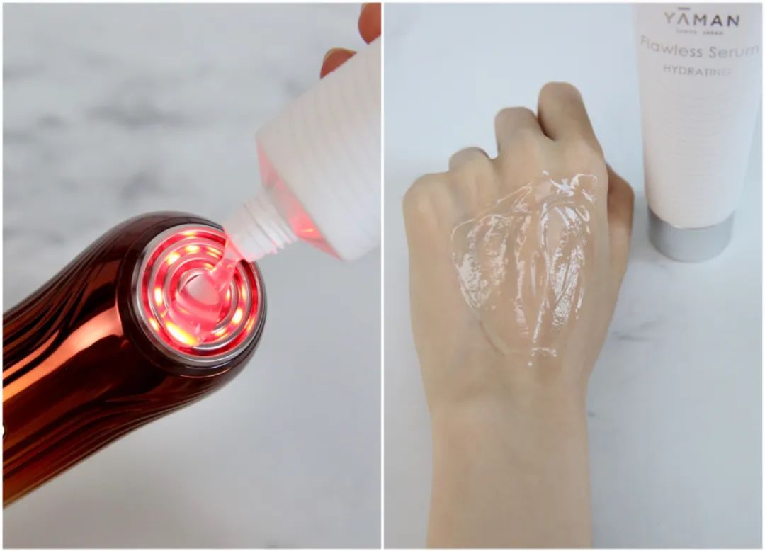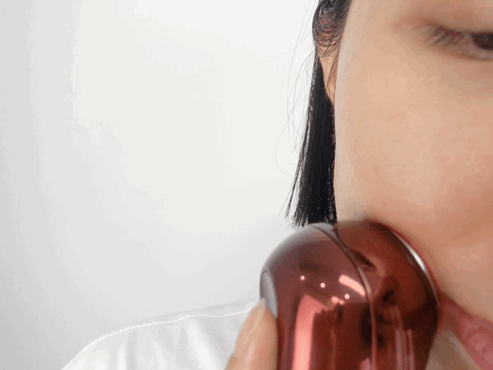 具体用起来也超级简单,来看助理妹子Youtin的示范——首先长按电源键打开仪器,再挤一点凝胶到电极头上。建议大家凝胶要用够量(大概4滴),这样才能均匀传导能量,仪器在脸上滑动的时候也不会拉扯皮肤。凝胶的质非常轻薄好推开,做完脸用水一冲就掉了。电源键下方的按钮可以调节档位,总共分为四个不同档位。1-3档是常规模式,打开后把射频头贴紧皮肤,就会有三种能量持续作用。新手可以从最低档开始尝试,电刺激的痛感会稍微小一点;用了一段时间之后已经开始尝试第二档了,被电得还有点爽~而四个指示灯全亮的时候,就是这次最让人惊喜的 POWER档,根据部位自动切换4种能量!它会自己根据下颌线-脸颊-眼周-额头四个部位分配相应的能量强度,所以用的时候也按照这个顺序来就行。雅萌还和皮肤学专家李嘉伦博士联合研发了针对这4大部位定制的“反重力”护理手法,能够帮助更好提拉下颌线、嘭弹苹果肌、淡化法令纹眼纹抬头纹,实现更有效的全脸提拉效果。首先是下颌线——向上滑动提拉紧致,再顺着脖子向下,大概60秒后会听到“滴滴”两声轻响,代表这个区域已经操作结束。这时候只要再轻按一下电源键,机器就会自动切换到下一个部位(脸颊)。然后是脸颊部位——会持续110秒,可以从嘴角和法令纹的部位整体斜向上移动,提拉下垂肉肉脸的同时,让苹果肌嘭弹起来~
