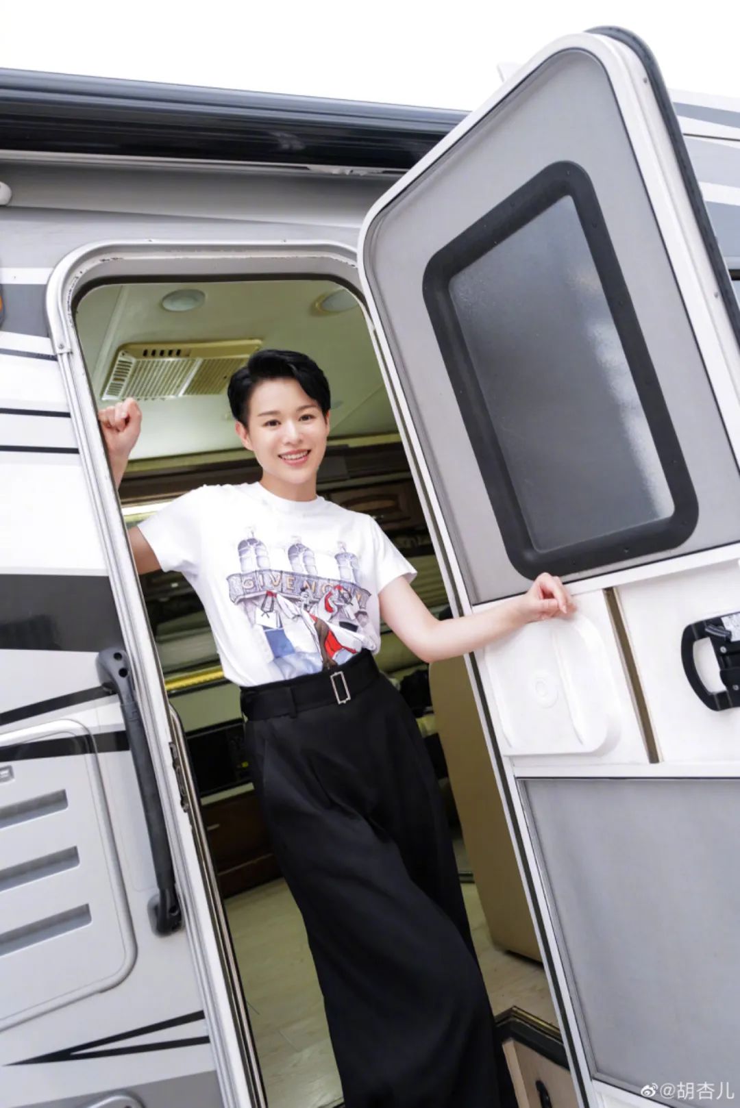 再加上灿烂的笑容,和二十出头的妹妹对比也没有年龄感。年轻的时候看起来不够精致的五官,到了四十岁反倒给人大气、舒适的美感。即使短发造型也能这么港风,整体的气质加分超多。