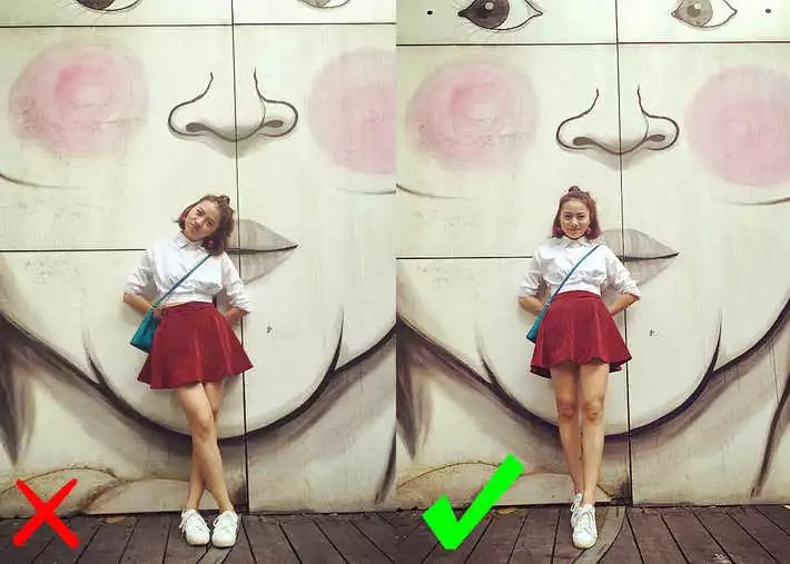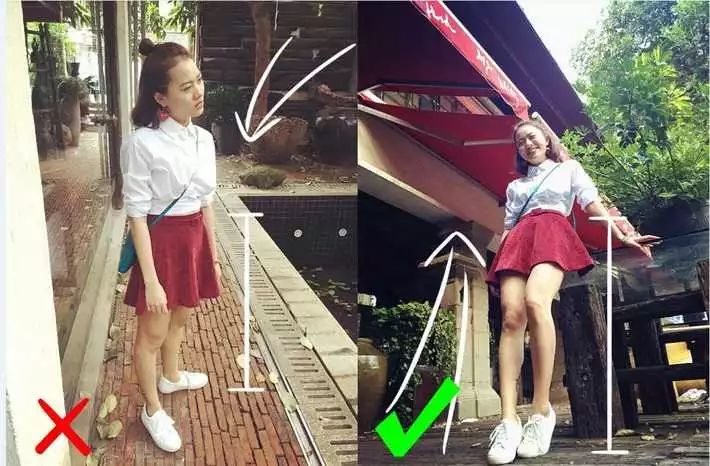 当然,照片显腿短也未必全是摄影师的错,还有可能是妹子站姿的问题,双腿不要交叉过分,一只脚向镜头方向延伸,就可以简单又有效的显腿长