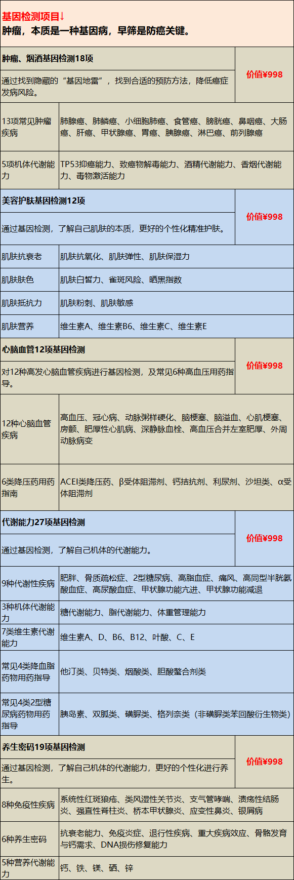 不仅如此,更是升级了基因检测项目:心脑血管12项基因检测、常见6类高血压药物用药指导、常见4类高血脂药物用药指导、常见4类2型糖尿病药物用药指导、养生密码19项基因检测、肿瘤13项基因检测等常见高发疾病检测项目!