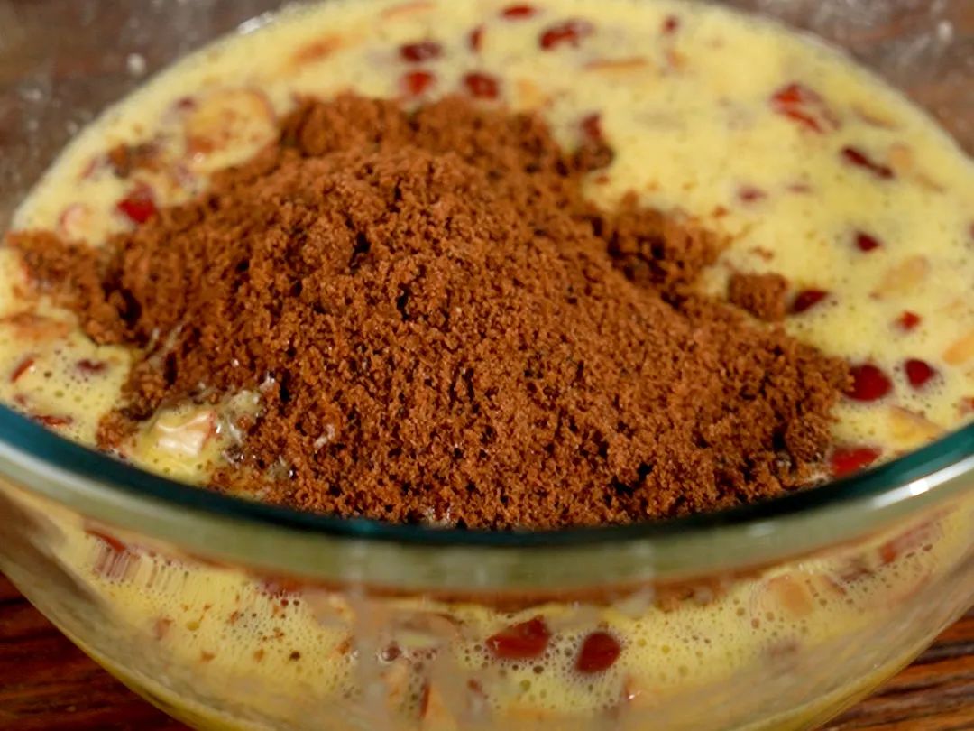 2.煮沸晾凉至常温,倒入大碗中,打入6个鸡蛋,放入红糖搅拌均匀
