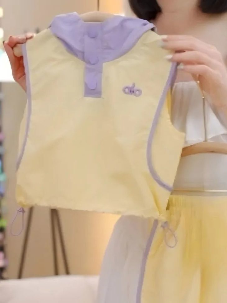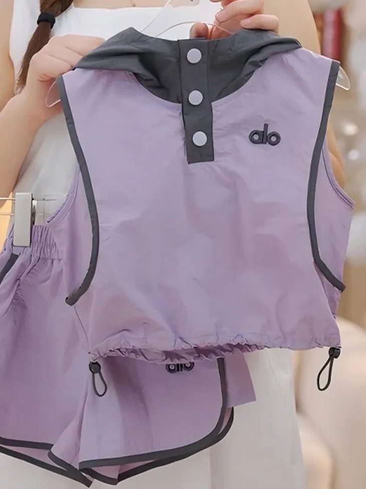 搭配的是短袖(连帽背心)+短裤套装,简洁又轻盈,面料同样轻薄舒适,清凉透气~