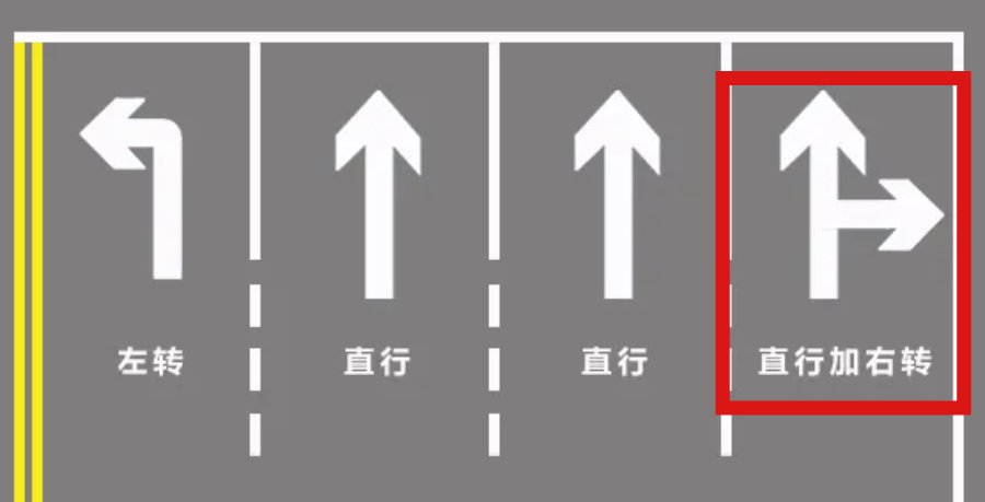 “直行+右转”车道,又叫混合车道,一般地面会画一个直行箭头+右转箭头的标线,意思是这条车道上,既可以直行也可以右转。