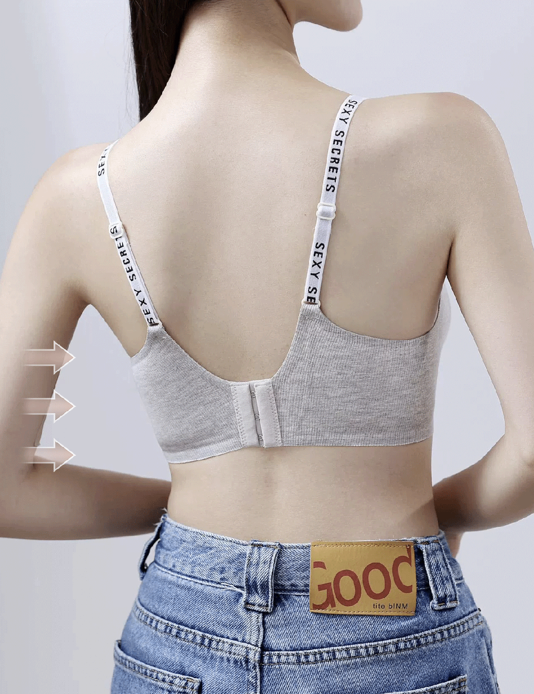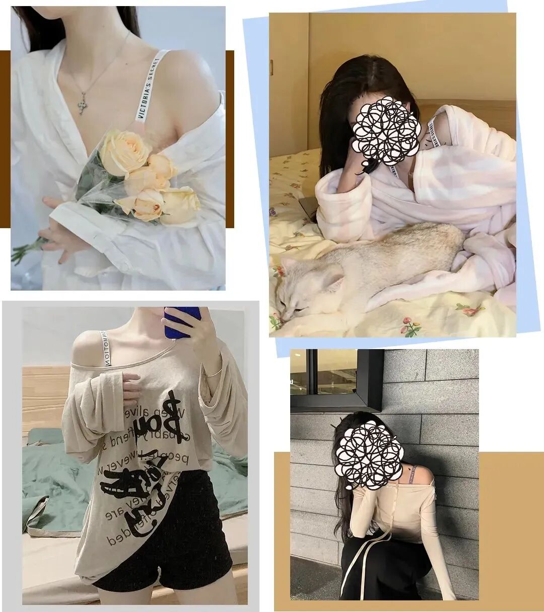 它的整体款式设计也符合大众审美,颜色全是衬肤色显白系,穿上超sexy~其中灰色款比较特别的是肩带还有字母logo设计,增添了时尚感,露肩带也不突兀。