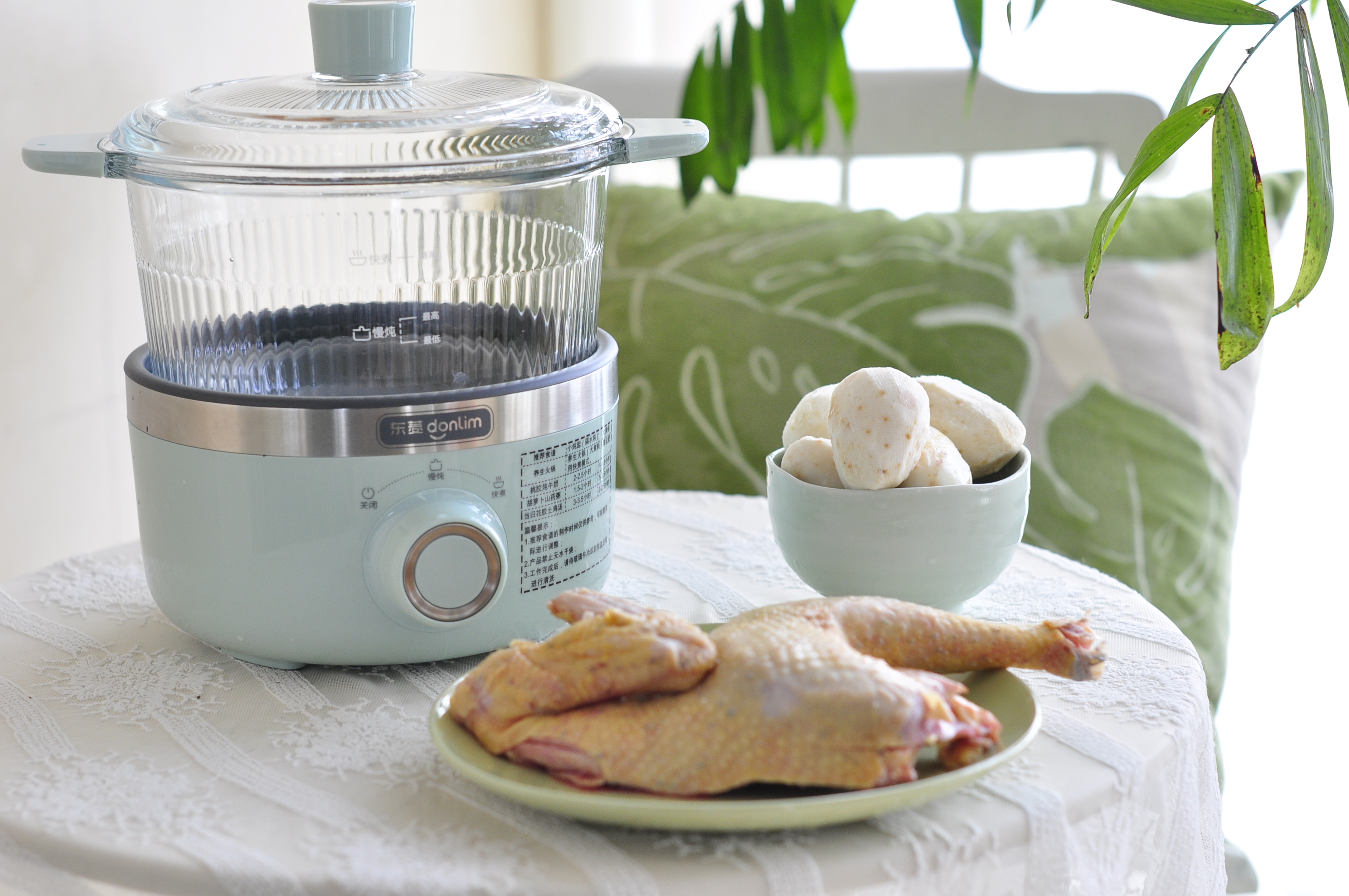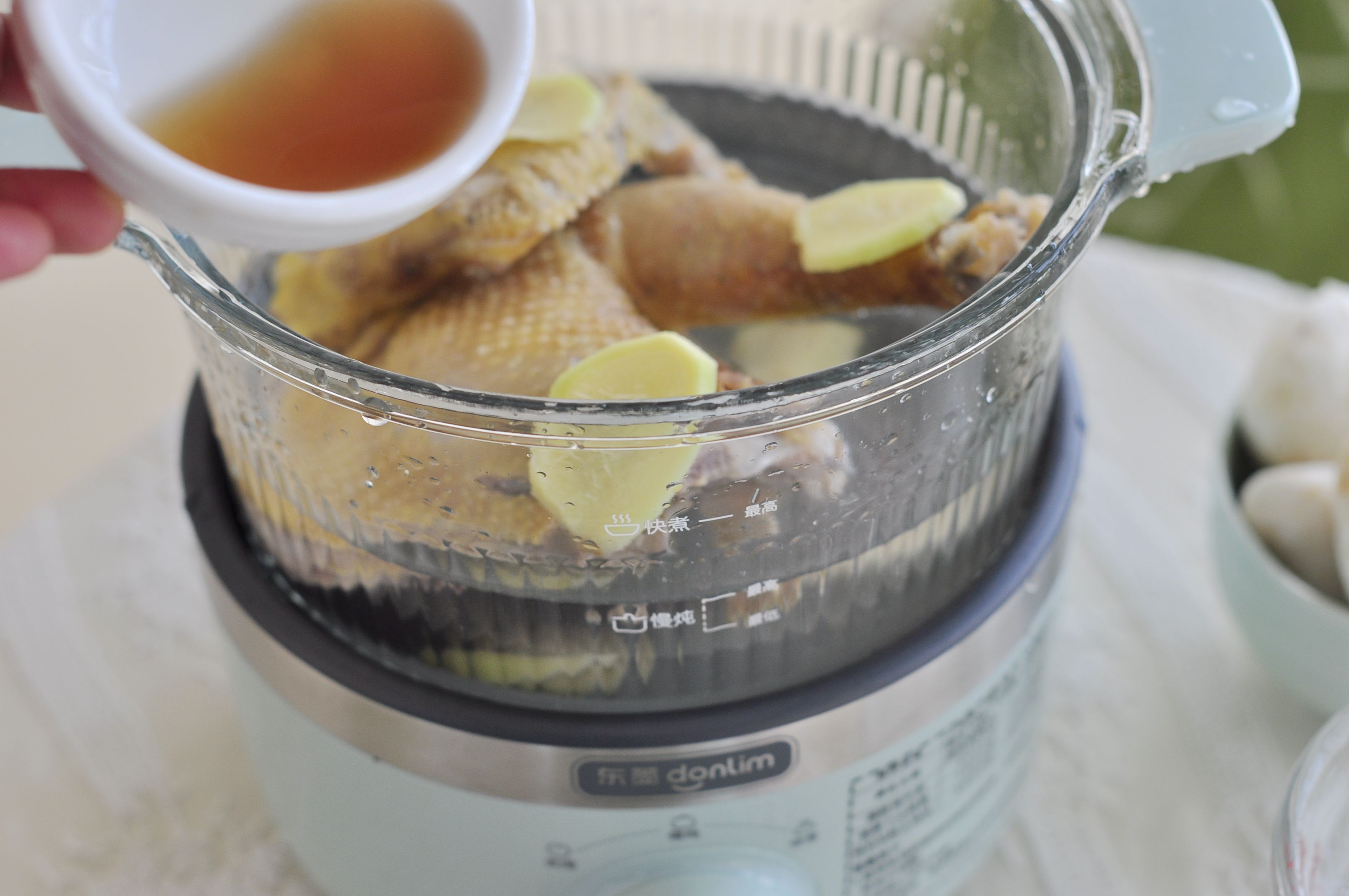 2. 鸡处理干净,焯水后放入东菱养生锅,加入姜片和适量的水。(加水时请不要超过快煮最高水位线,以免锅内液体沸腾后溢出。)