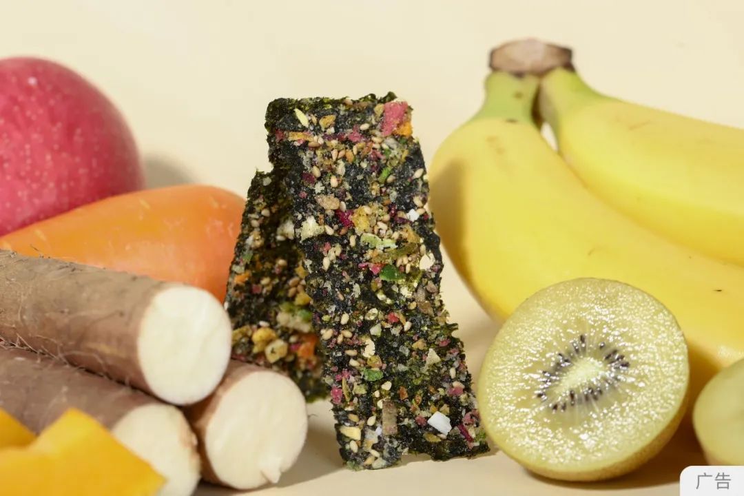 不仅如此,我们将日常所需的水果和蔬菜都以脆片的形式添加到海苔上,吃一片海苔就可以吃到4种水果脆片和5种蔬菜脆片,小小的一片海苔,食材丰富多样,我们再也不用一会吃这一会吃那的,既能照顾脾胃,又不给脾胃添加负担。