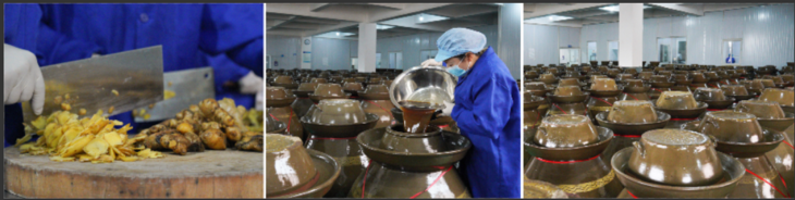 醋泡姜生产全过程均在无菌车间内完成,恒温车间传统大坛90天浸泡腌制。产品不添加任何防腐剂和化学成分,并经巴氏消毒,除去其有害微生物,并最大限度地保存其中营养物质。