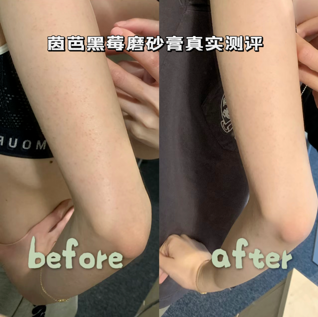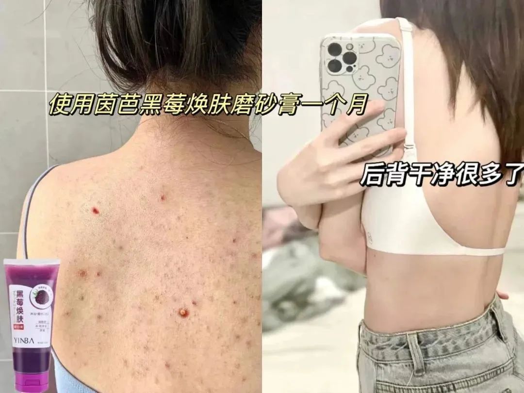添加烟酰胺成分的黑莓焕肤磨砂膏使用起来,不仅可以有效控制黑色素来源,减少肌肤的黑色素沉着,达到令肌肤亮白的效果。还可以控油治疗痤疮,背部有痘痘困扰的姐妹终于可以实现吊带自由啦!