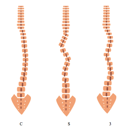 脊柱问题基本上分为两大类,一是侧弯类,二是曲折类。典型的包括C型、S型和3型等(如上图)。C型即为抛物线形,还有耳朵状的,像数字里的“3”,此外还有S型以及斜线状等。