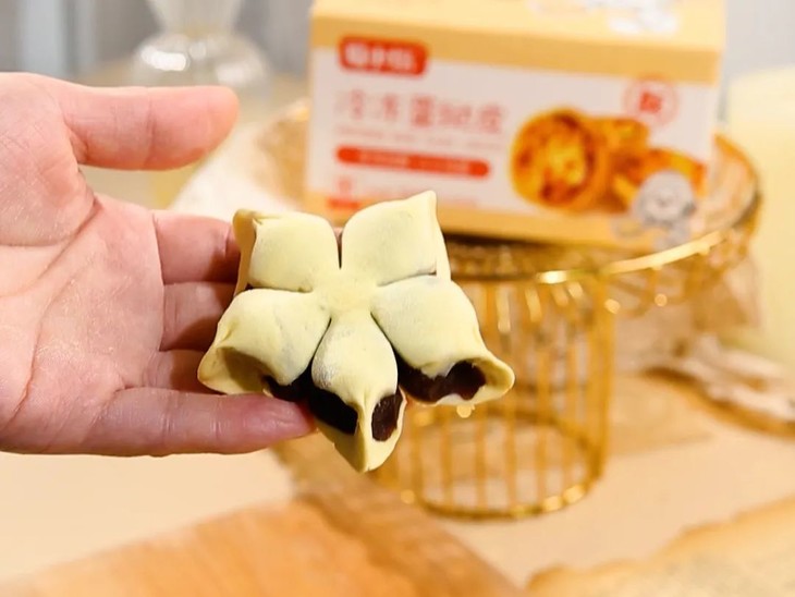 1.取出蛋挞皮,包裹豆沙馅料