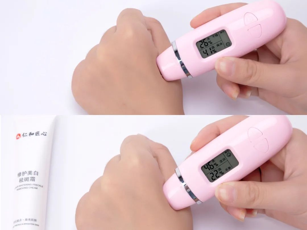 通过测试可以发现,涂抹过的部位水分提高了20%,油脂降低了一半,肌肤弹性也明显变好了。