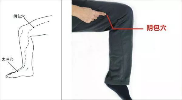 1、轻敲3-5遍后,在大腿内侧的“阴包穴”会有强烈痛点,可进行点揉。