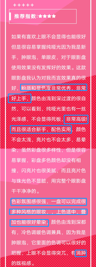 颜值爆表当然是意料之中的事情,又一位始于颜值终于实用而被征服的宝贝!“Equinox Flower”童鞋给出的评价是:绝绝子!日常实用,轻松搞定氛围感妆容~一盘可以完成很多种风格的眼妆,上色适中,叠加也能很好晕染。不过,竟然还能消肿?!本水肿到睁不开眼的社畜支棱起来了,大喊我可以!划重点:新手友好哦!