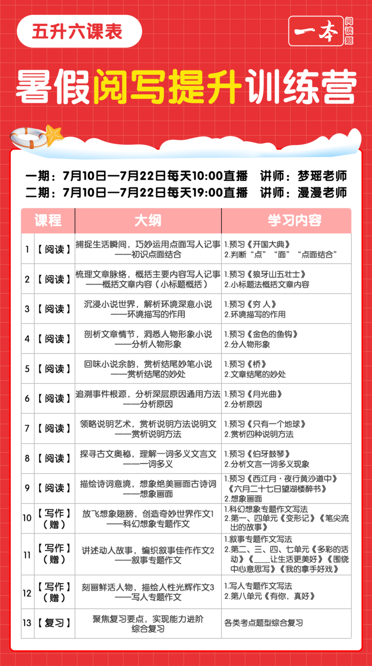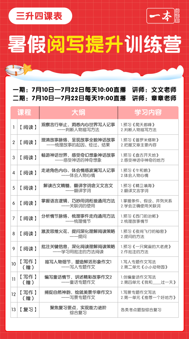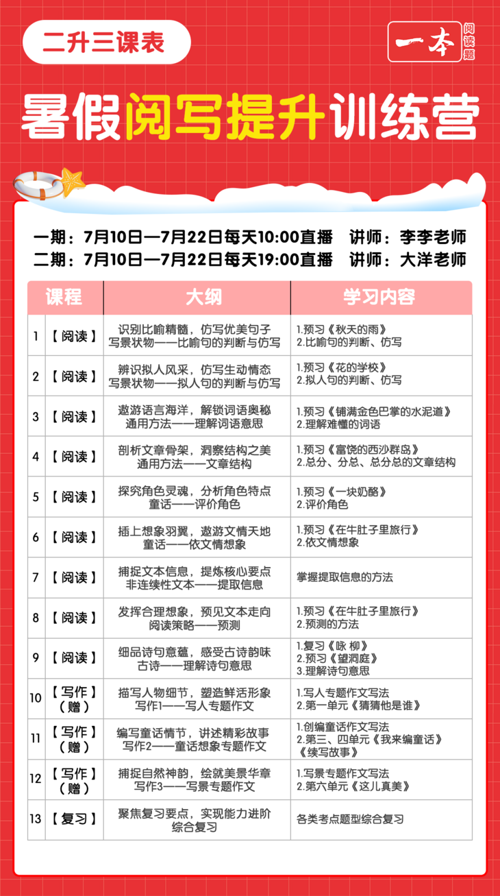 安排在了7月22日,上完课也会有打卡。在这节课中,老师会把阅读和写作的重点知识再梳理一遍,哪些是经常考的,哪些是需要重点掌握的,哪些是容易错的,都会给孩子讲解清楚。还会出一些综合性的题目让孩子检验自己是否真正掌握了这些知识。也会教给孩子考试中应对综合题型的方法和技巧,这样孩子在考试的过程中才会从容不迫。