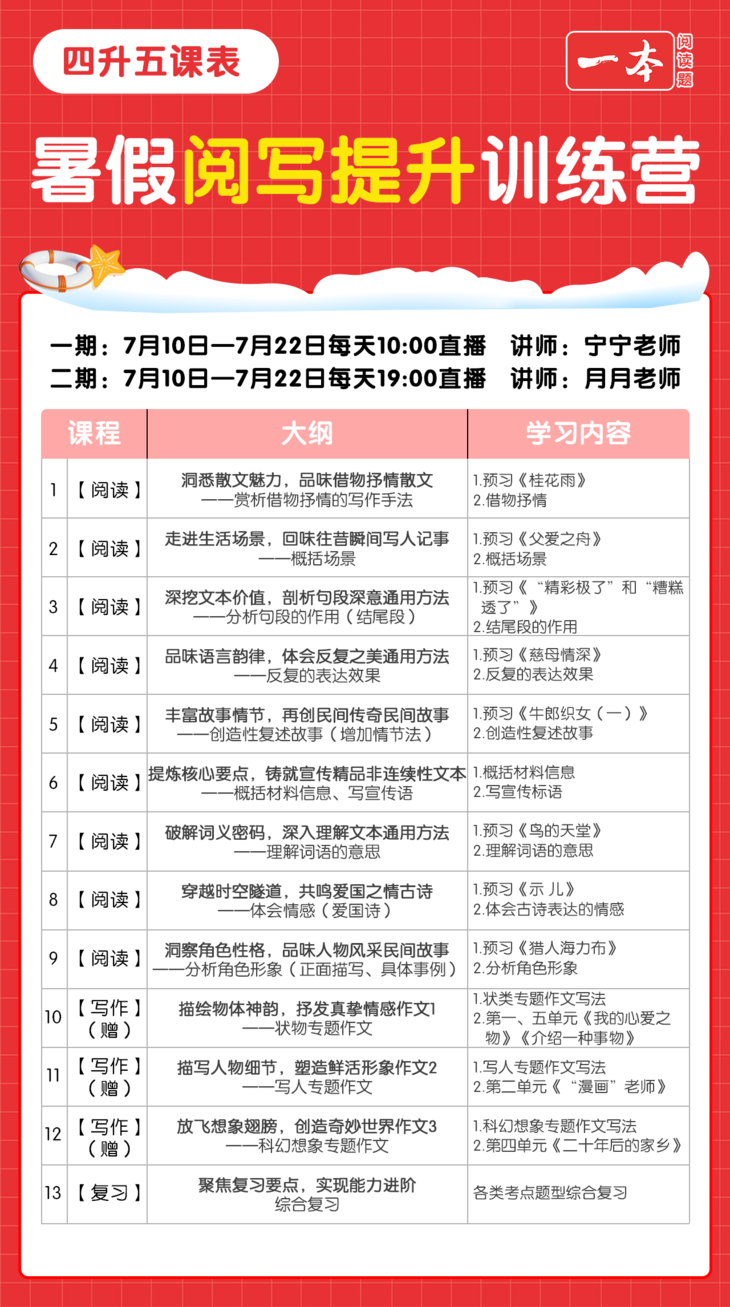 从7月10日-7月18日每天都会开启直播课,每节课的时长为60分钟。主要是学习阅读方法和技巧,老师会带着孩子从分析文章的结构到理解作者的意图,再到掌握并运用答题方法。每天一点点的深入,让孩子每天都有小进步。