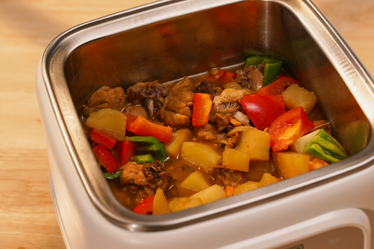 5、然后放上香菇,盖上盖子后,选择“火锅功能”,火力调至P1, 焖煮15分钟。时间到开盖倒入土豆丁,再焖煮15分钟至土豆完全熟透。