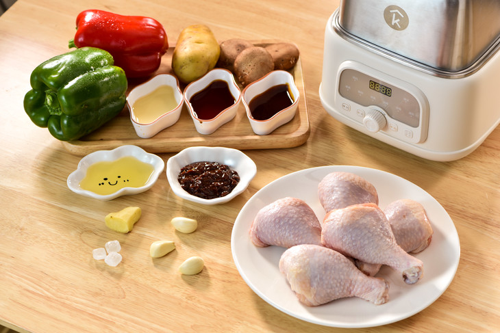 4、倒掉墩墩锅中的水,选择“快煮功能”,放入适量油烧热,下鸡腿 肉翻炒。接着放姜蒜粒和调好的酱料再次翻炒均匀,倒入适量沸水没 过食材煮开,放入冰糖。