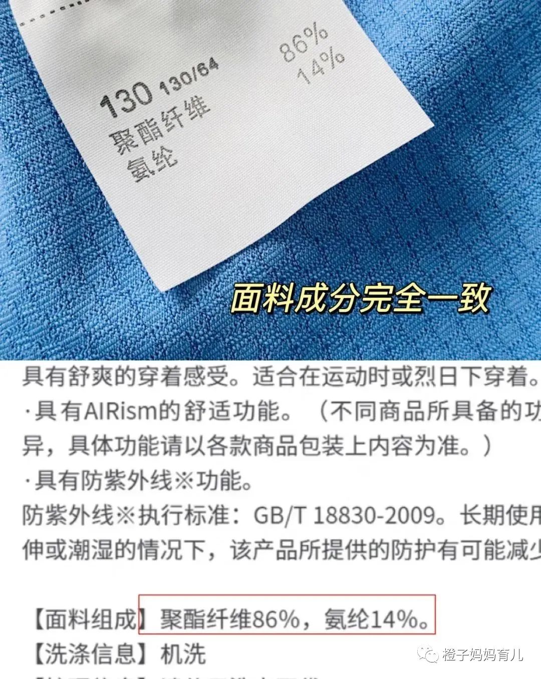 面料成分都一模一样。上面是开团款防晒衣洗标成分,下图是优衣库防晒衣的成分,完全一致。