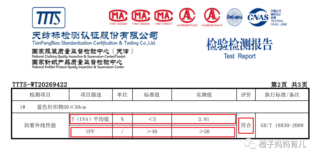 从质检报告看,咱们这款防晒衣UPF50+,T(UVA)AV透过率3.81%,小于5%,质检合格。