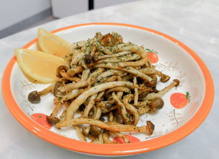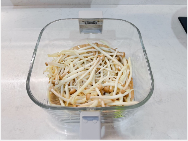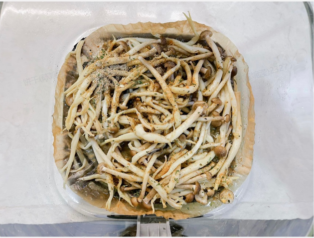 1、蟹味菇洗净,拧干水分,平铺在空气炸锅里,也可以先垫一张油纸