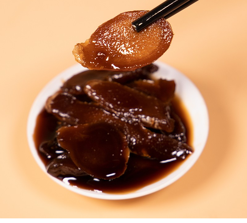 从鲜姜到成品,每一道工序都传统手法,精耕细作,只为每一口难忘:挖姜、洗净刨皮、腌制、晾干、切片、灌汁等9道工序。