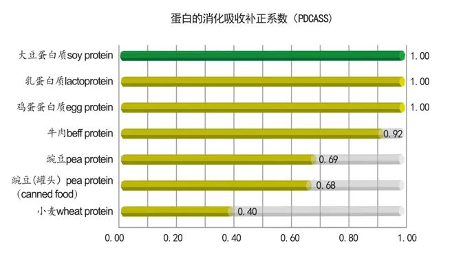 (PDCAAS,即蛋白质消化率校正氨基酸计分,得到联合国粮农组织和世界卫生组织专家委员会的正式公布和推荐。满分为1,分值越高,消化吸收率越高)