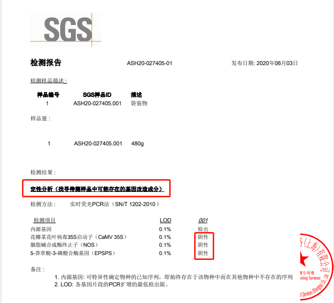 知名检测机构SGS出具的:大豆拉丝蛋白的非转基因报告
