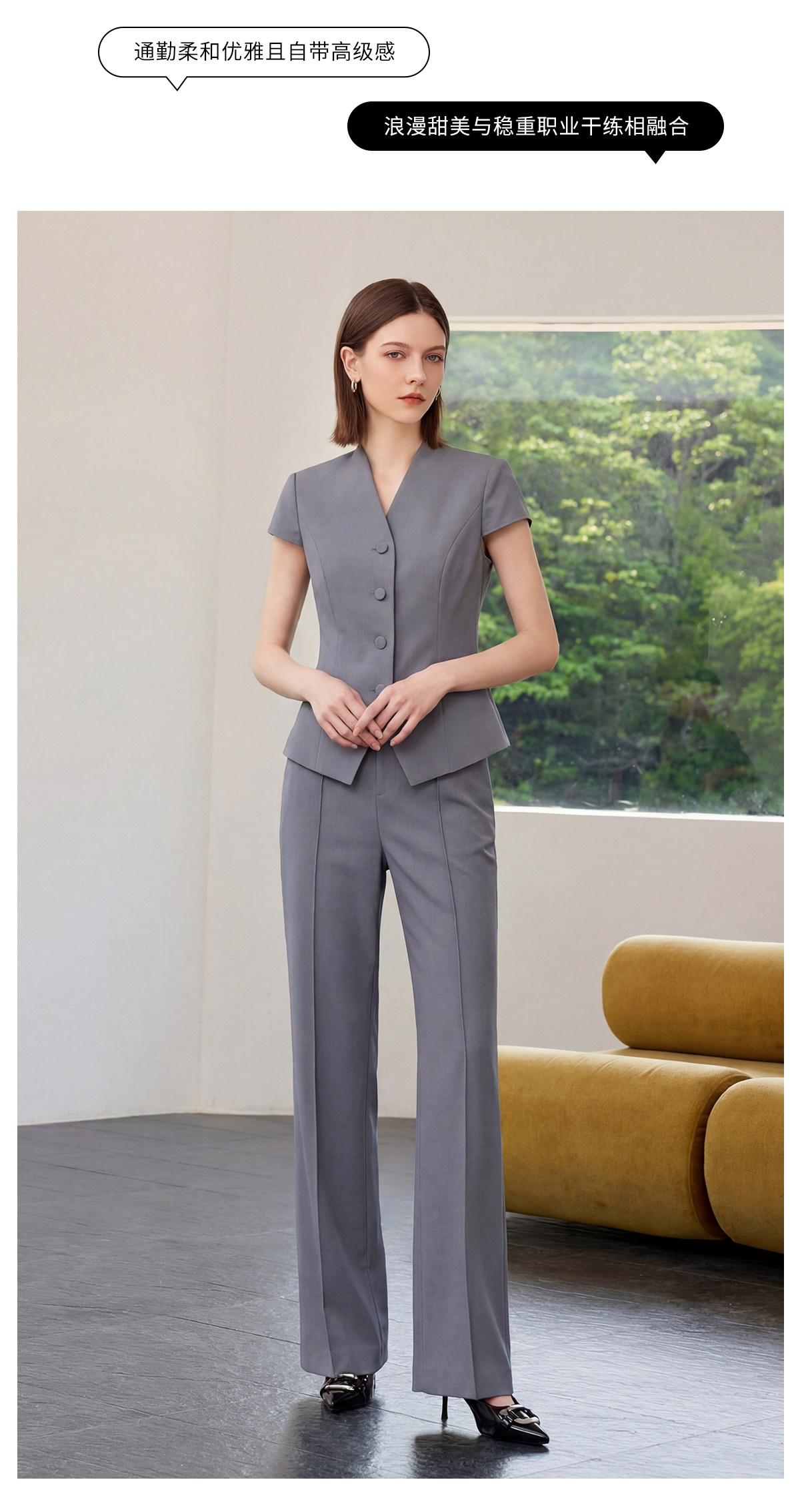 一身高级灰短袖职业西装,解锁职场专属优雅气场。利落V领温柔修饰脖颈线条,简约大气不张扬。