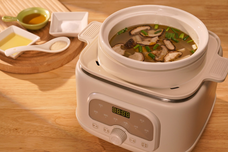 2、海鲜菇和香菇洗净,墩墩锅中加入适量清水,放入海鲜菇和香菇,选择“快煮功能”焯水2分钟捞出。