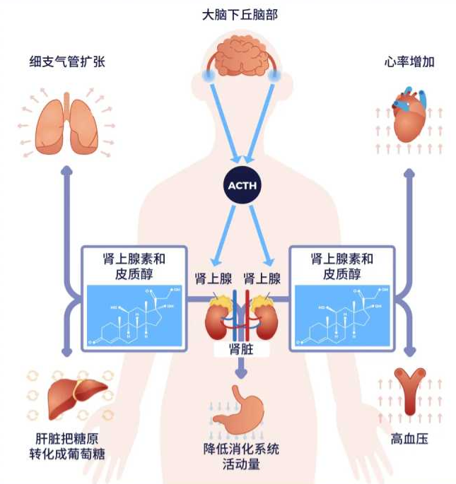 皮质醇是由肾上腺产生的一种压力激素,急性快速产生时有利于调节新陈代谢、减少炎症,而慢性持续产生时则会对人体产生比较大的负面影响,如持续警觉、肌肉分解代谢以及向心性肥胖等。
