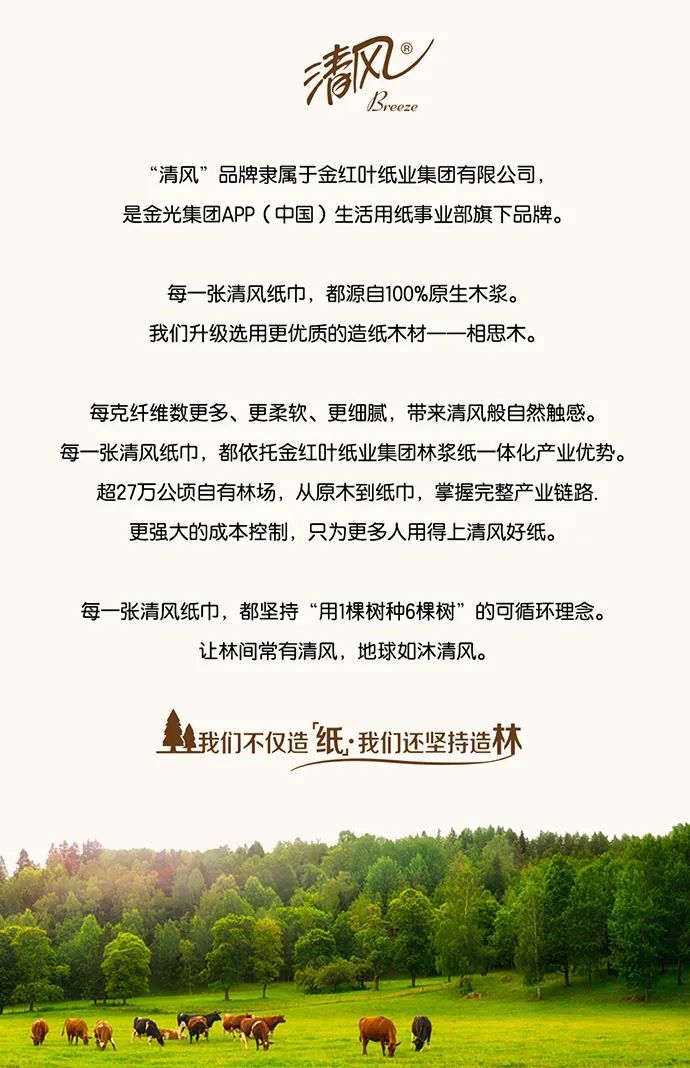 清风品牌始终坚持使用100%原生木浆,造就每一张柔韧好纸。承诺"每用1棵树,种植6棵树",为了一张纸,造了一片林,环保投资超过100亿元人民币。