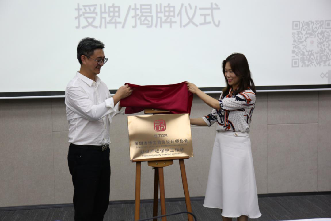 在现场众人的期待中,李媛处长和杜半会长一起,为深圳市珠宝首饰设计师协会知识产权保护工作站举行揭牌仪式。此次揭牌仪式意义重大:在政府的支持协助下,协会将更加积极主动地联合各相关的知识产权保护单位、律师团队、珠宝企业及设计师,为珠宝行业的知识产权保护工作建立更加专业、系统、完善的知识保护平台;加强协会的专业服务能力,进一步提升行业的原创服务能力及自主创新能力,提升行业自信心。