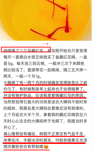 持续喝了3个月的网友表示:“大概喝了有一两个月的时候确实觉得肤色比之前均匀了,有时候熬夜早上起来也不会觉得黯黄,并没有换护肤品,应该就是喝藏红花的原因。”