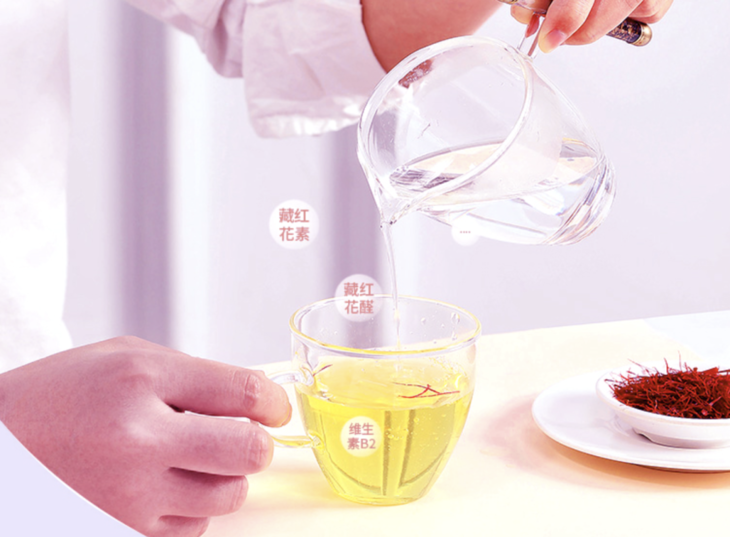 慢慢的,作为主力军的藏红花苷开始发挥作用,入水后变成了洒满阳光的金黄色。