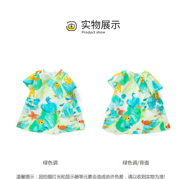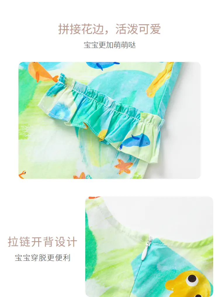 采用拼接花边的设计,多彩印花,凸显宝宝活力氛围