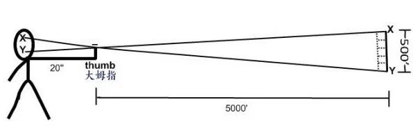 对这个方法有所了解后,你肯定会好奇,为什么是姆指移动距离乘以10呢?以下就简单讲一下这个测距方法的原理(懂与不懂都可以用这个方法)。
