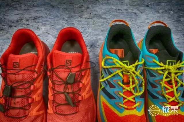 和另一款有防水透膜设计的越野鞋面对比,加入防水膜后有一层类似金属的光泽度,当然增加了防水性就舍弃了部分透气性,二者很难兼得。