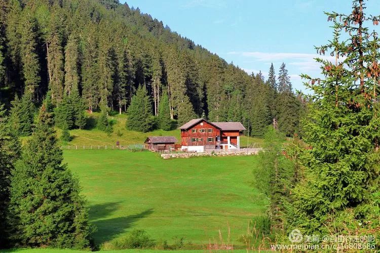 缓坡下行,眼前又出现了美丽的田园牧歌景象,阡陌纵横,木屋点缀在绿草茵茵的山坡上,成群的牛儿悠闲的吃着草,光影明暗交错在草甸上,宛如人间仙境。