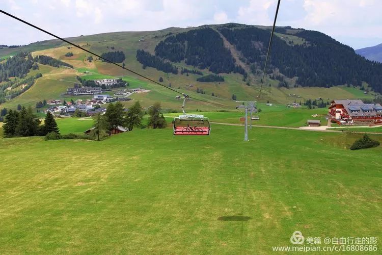 午餐后,我们又乘坐另一条缆车再次上到阿尔卑斯最广阔的高山草甸,站在高处远眺,广阔的高山草甸后面是是山体岩石犬牙交错的Sciliar-Catinaccio卡蒂纳乔群峰。